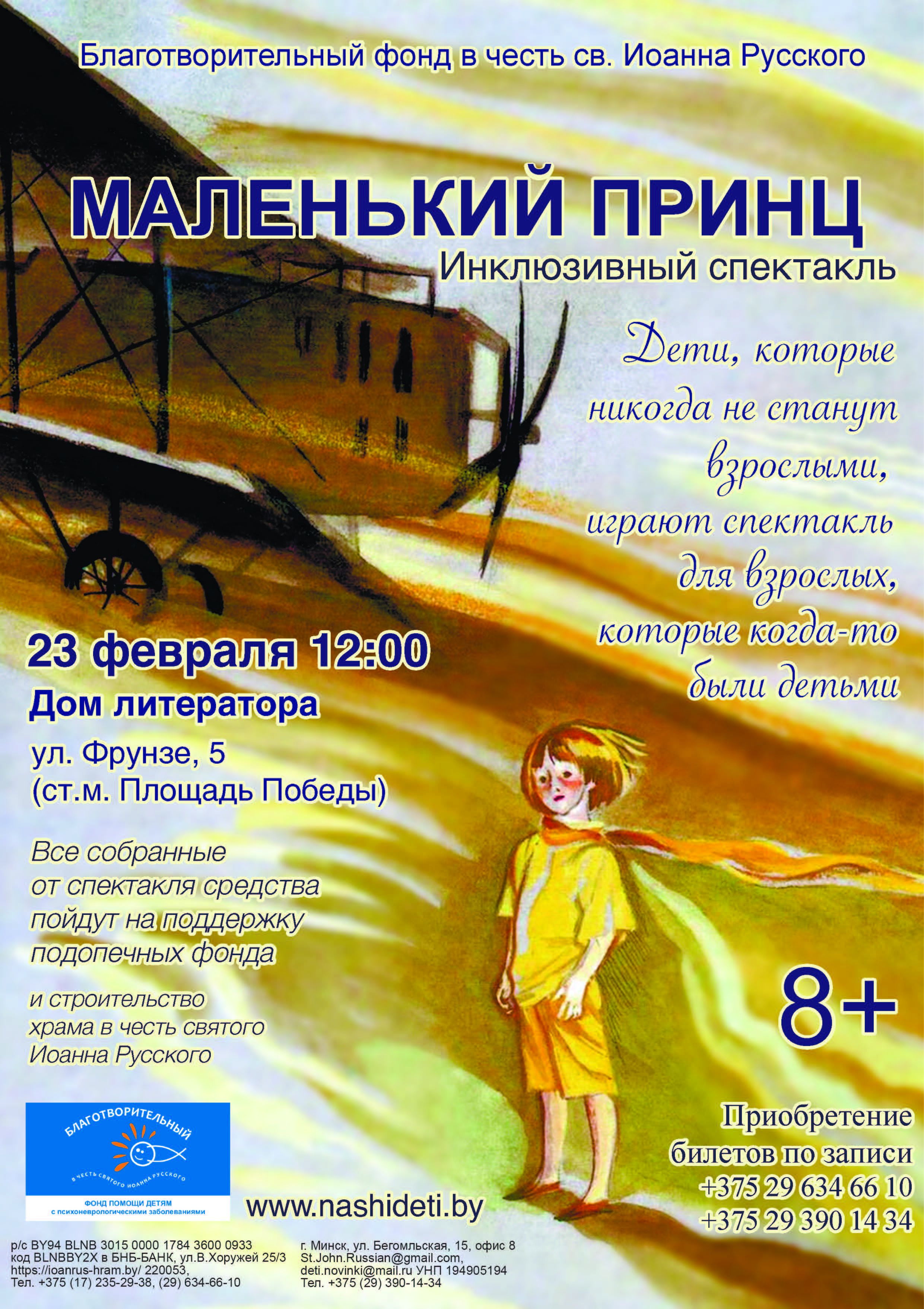 Дорогие друзья! Приглашаем вас на повтор спектакля “Маленький Принц”. В воскресенье 23.02 в 12:00 в зале Дома литератора по адресу ул.Фрунзе 5 (ст.м. Площадь Победы).
