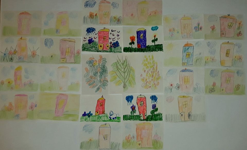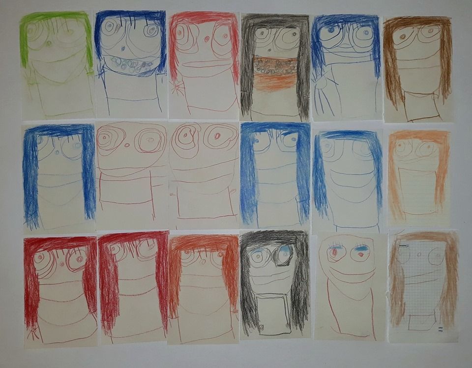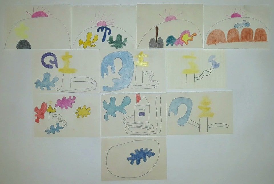 Несколько лет назад у нас на занятиях рисованием была бумага маленького формата – с ладонь. А теперь мы взяли и посмотрели на все эти рисунки одновременно. В рисунках каждого кружковца нет разнообразия, постоянно повторяющаяся тема говорит нам о личности автора.
